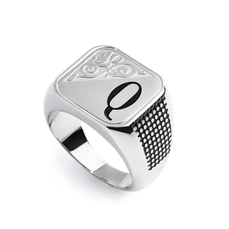 Piastrina squadrata per anello, sulla parte frontale un’incisione con texture e lettere in black oil. Sul retro logo Marlù inciso.
