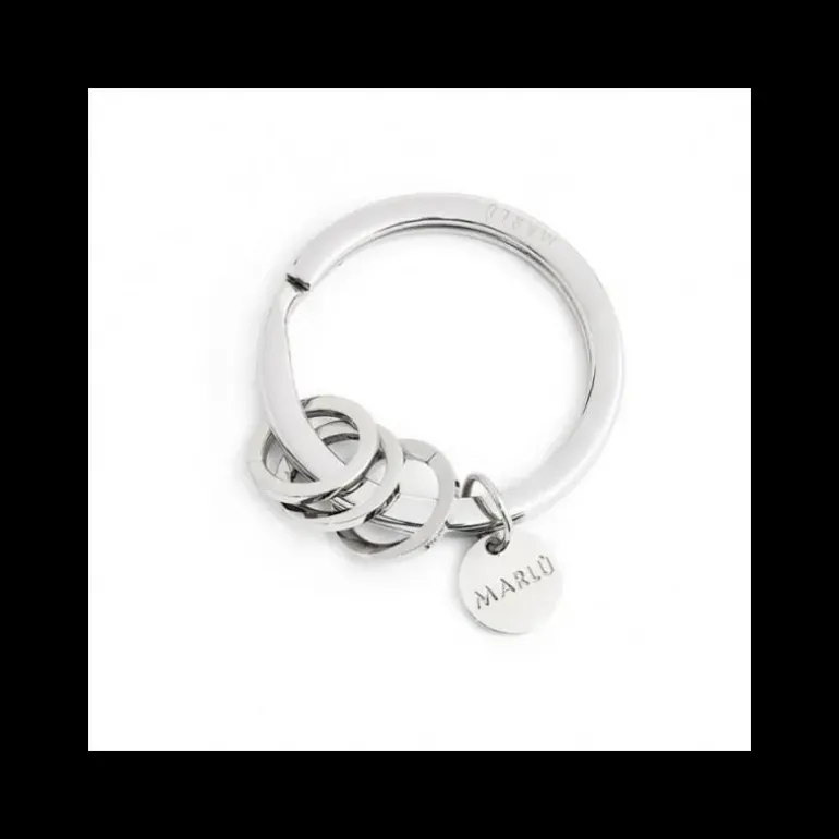 Portachiavi con anello di 30 mm in acciaio, contenente tre anelli piccoli e targhetta tonda con logo Marlù. Materiali: acciaio Collezione: ACS03