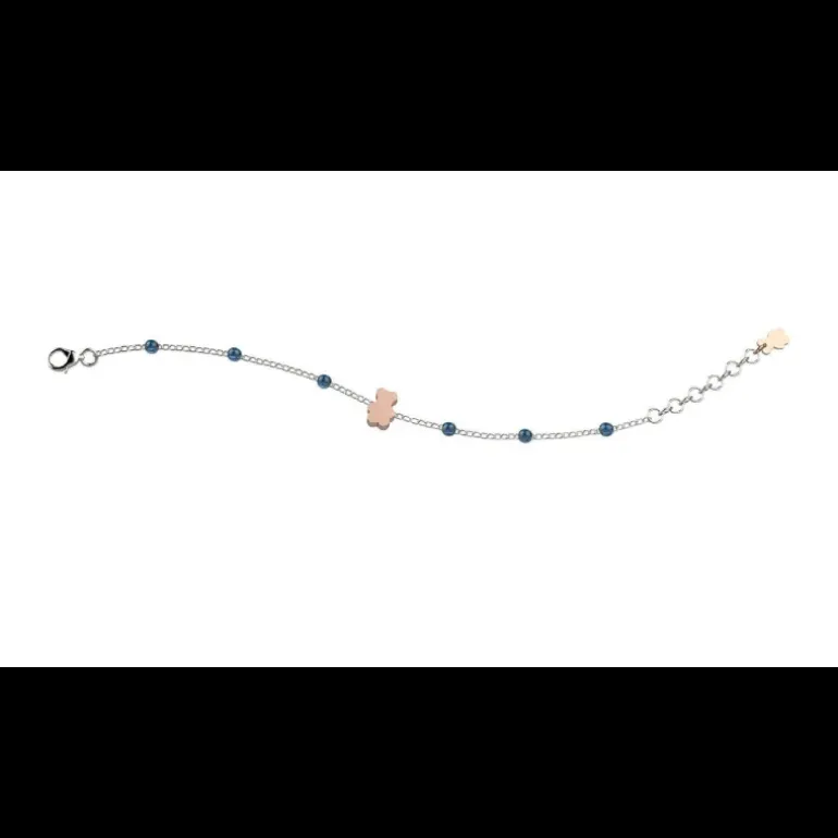 Delizioso bracciale in argento impreziosito da perline azzurre e dal dolcissimo orsetto Tato.
