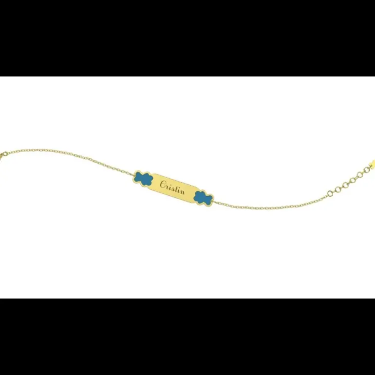 Delizioso bracciale in oro 9 carati impreziosito da una dolce targhetta personalizzabile e orsetti azzurri ai lati. Misure: 13-15 cm