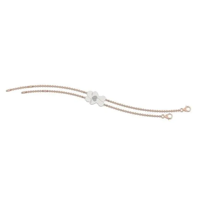 Braccialetto sinonimo di amore fra mamma e bimbo, un doppio filo placcato in oro rosa che si unisce (e si slega alla necessità) con un tenero orsetto in argento puro.