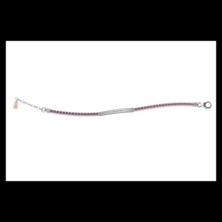 Il raffinato bracciale tennis in argento puro della linea Nanàn Bijou reso unico e speciale dall’etichetta centrale personalizzabile. VERSIONE ROSA.