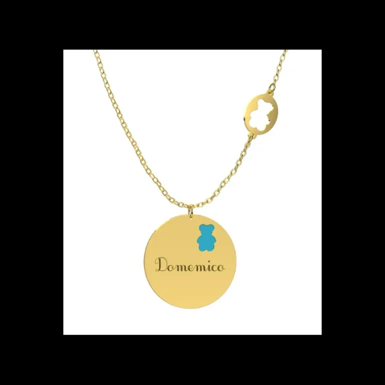 Adorabile pendente in oro 9 carati, impreziosito da dolce placchetta personalizzabile con orsetto azzurro verniciato. Misura: 20cm