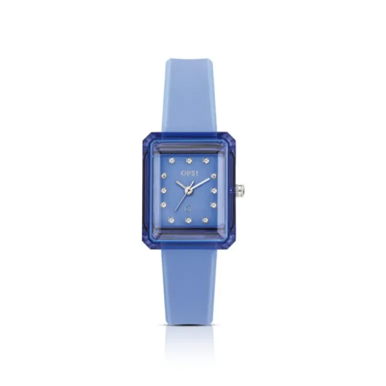 Cassa in plastica trasparente 22 x 27 mm e vetro sfaccettato. Quadrante con pietre. Fondello in acciaio. Movimento Y121. Water Resistant 5 atm. Cinturino in silicone colorato. Larghezza cinturino: 14/12 mm. Circonferenza interna del cinturino: da 175 mm a 140 mm. Chiusura ad ardiglione.