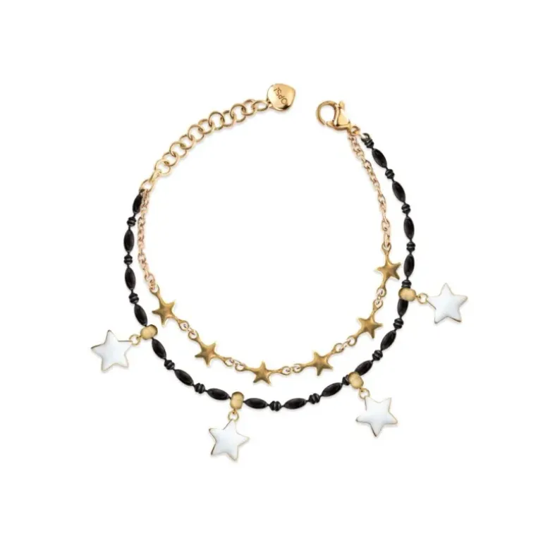 Bracciale doppia catena in acciaio cuori e stelle personalizzato con cuore OPS. Pendenti a cuore e stelle smaltati. Trattamento PVD oro rosa e oro giallo. Lunghezza 17 cm regolabile a 20 cm.