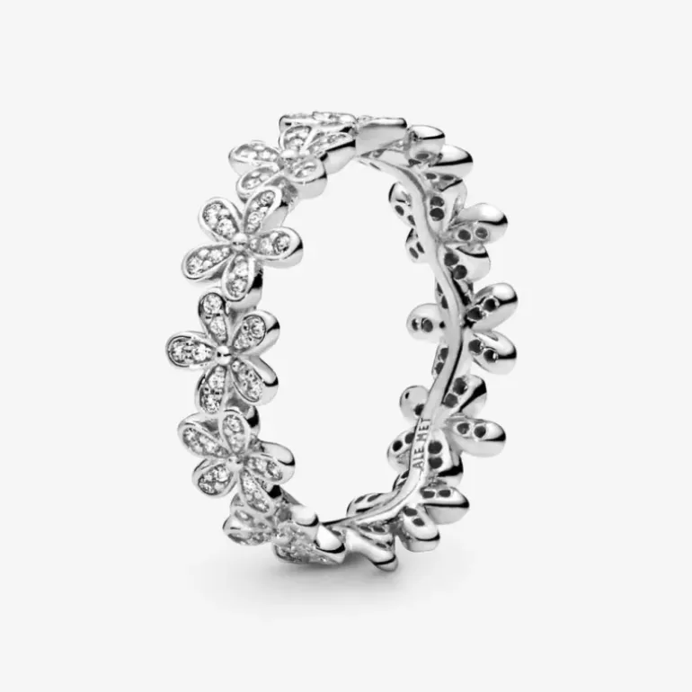 Questo scintillante anello margherita Pandora in Argento Sterling 925 avvolge il dito con i suoi fiori delicati. Emblema di gioia e felicità, la preziosa coroncina di margherite è ornata di pietre di zirconia cubica scintillante che giocano con la luce. Da indossare da solo per un look semplice ed elegante, o insieme agli orecchini margherita Pandora e alla collana abbinata per un favoloso look floreale.