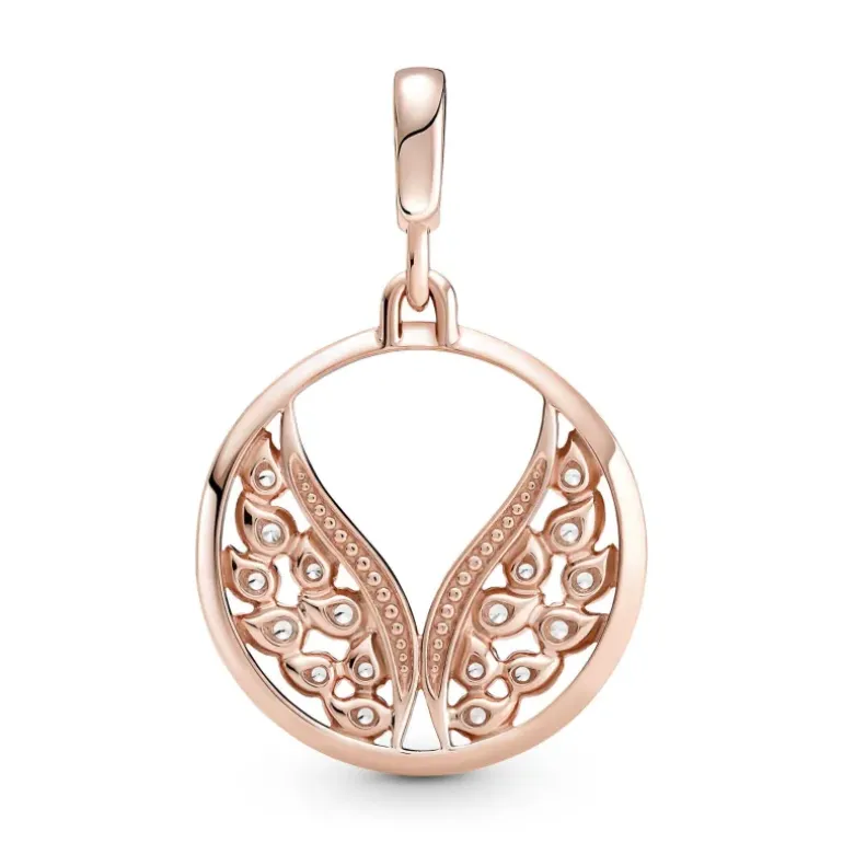 Diventa la protettrice di te stessa indossando il medallion Burning Wings Pandora ME. Rifinito a mano e realizzato con placcatura in oro rosa 14k, il medallion presenta ali d’angelo scintillanti decorate da pietre di zirconia cubica con taglio brillante all’interno di fiamme che si intersecano e simboleggia le potenzialità e il sentirsi sempre in controllo. Inserisci il Medallion su orecchini a cerchio, collane e bracciali a maglia link a seconda del tuo mood e indossalo ogni giorno come amuleto portafortuna. Il medallion può essere inserito sia su link chiusi che sui connettori apribili grazie al suo gancio semplice da chiudere con un clic.