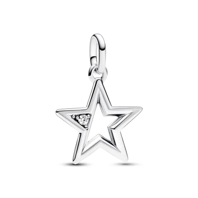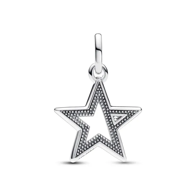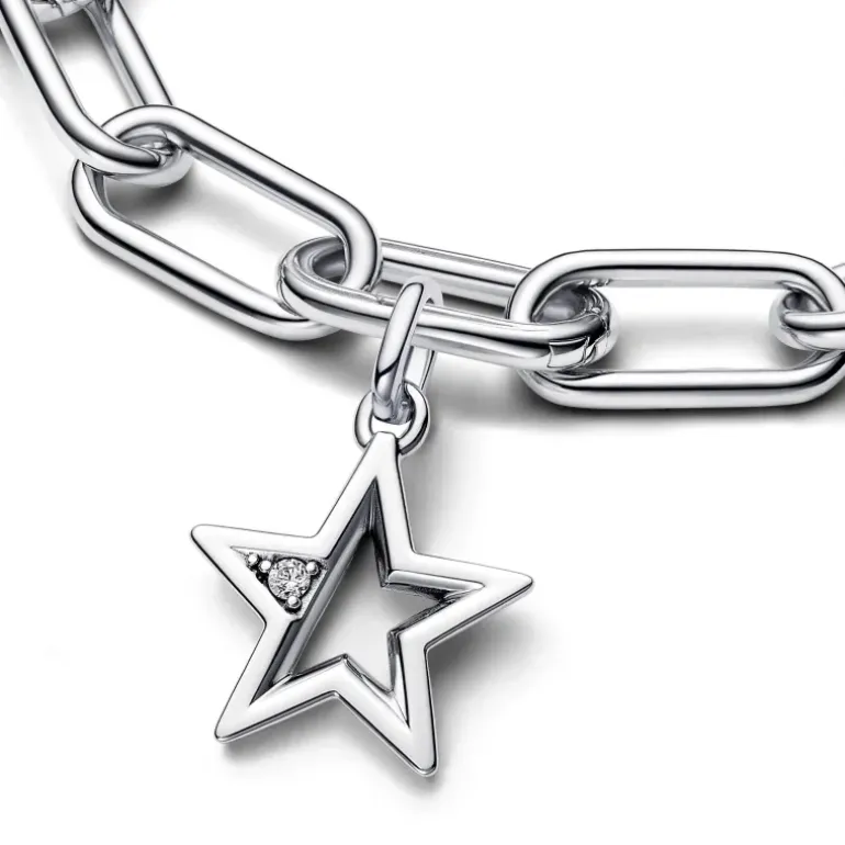 Crea il tuo look unico con questo Charm Medallion Star Pandora ME. Realizzato in Argento Sterling 925, questo gioiello raffigura una stella a cinque punte con un profilo a forma di prisma con due lati dritti e uno leggermente curvo. Una punta della stella presenta una scintillante pietra di zirconia cubica incolore. Il retro presenta un motivo a microsfere circondato da una linea rialzata. Compatibile con i gioielli Pandora ME e Moments.