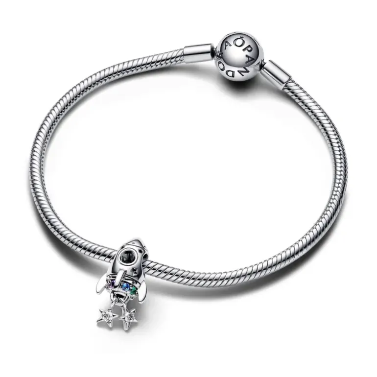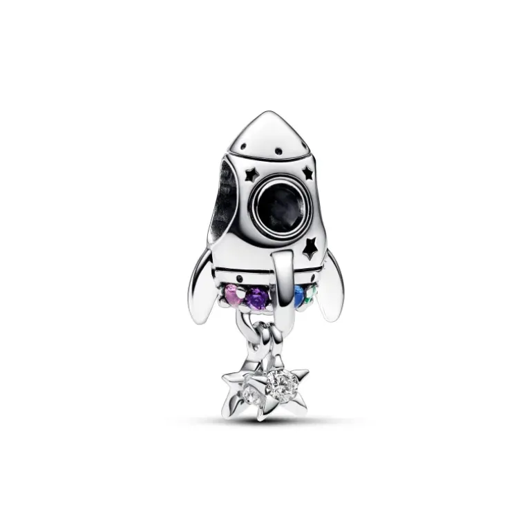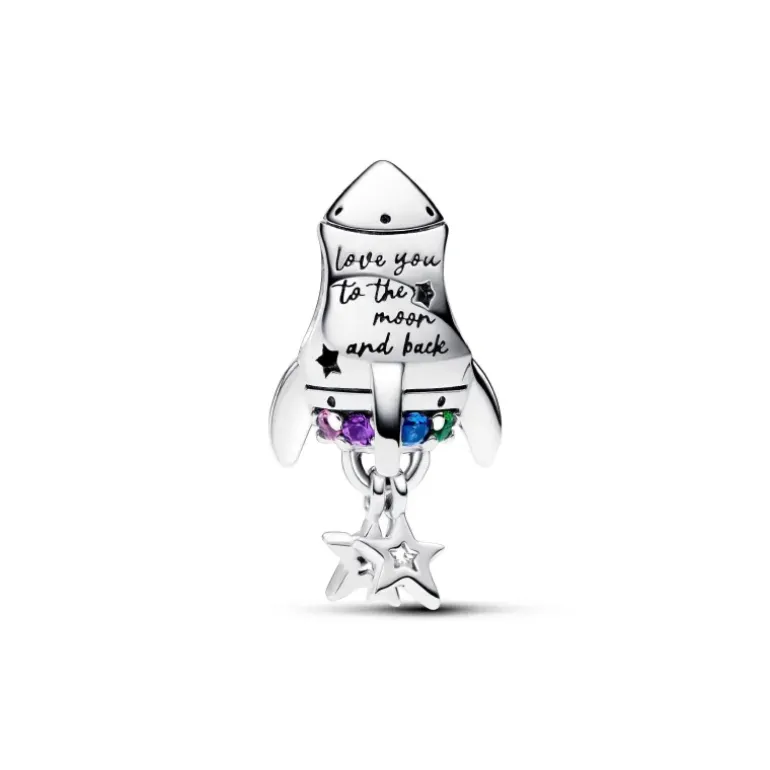 Raggiungi le stelle con il Charm Navicella Spaziale. Realizzato in Argento Sterling 925, questo charm ti dimostra che, con un po’ di immaginazione, puoi sempre raggiungere i tuoi sogni. Un lato del charm presenta un’apertura rotonda con una linea scanalata che raffigura un oblò, con stelle intagliate che lo circondano. L’altro lato reca l’incisione “Love you to the moon and back” (Ti amo fino alla luna e ritorno), mentre la parte inferiore della navicella è decorata da cristalli colorati creati dall’uomo e da due stelle pendenti impreziosite al centro da pietre di zirconia cubica incolore. Indossa questo charm sul tuo bracciale o regalalo a una persona che ami per ricordarle sempre di sognare in grande.