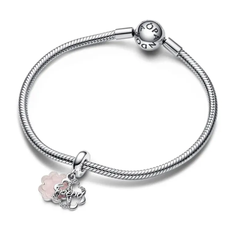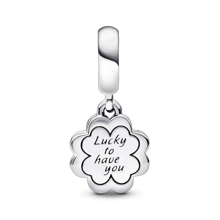 Il nostro charm pendente doppio Amicizia con quadrifoglio reinterpreta un simbolo riconosciuto di buona sorte aggiungendo un messaggio d’amore e riconoscenza. Realizzato in argento sterling 925, presenta cuori intagliati che si uniscono per formare un quadrifoglio su un pendente. L’altro pendente, anch’esso a forma di quadrifoglio, è ricoperto da smalto rosa cipria su un lato e reca un’incisione sull’altro: “Lucky to have you” (Sono fortunato ad averti). L’aggiunta perfetta per un bracciale ispirato all’amicizia.