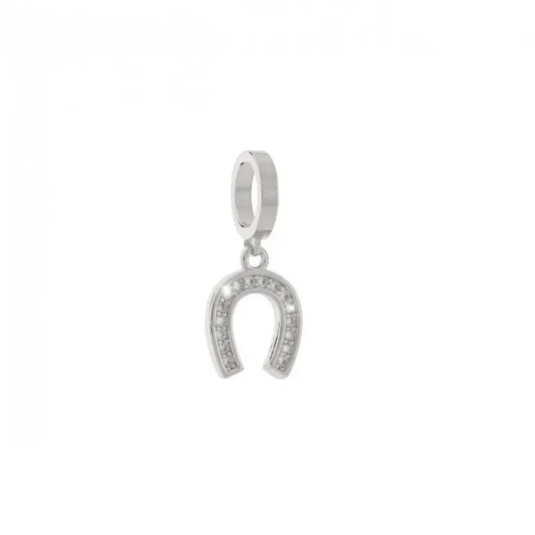 Charm da donna Rebecca della collezione MyPave, in bronzo rodiato. Charm da donna impreziosito da cristalli bianchi che conferiscono uno stile moderno e glamour. Questo charm da donna Rebecca,grazie al significato legato al ferro di cavallo (successo, buona sorte, destino), è ideale da regalare a una persona cara per un buon augurio