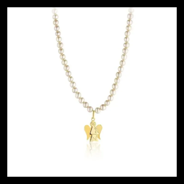 Collana di perle con pendente Angelo in oro giallo. Il filo di perle accoglie un angioletto davvero splendido che conferisce un tocco celestiale che è simbolo d’amore e al tempo stesso protezione, sarà di buon auspicio per la donna che lo indossa. Inoltre le perle, sono da sempre simbolo di purezza e esaltano naturalmente la bellezza della donna che le indossa. Oro 375/°°° Lunghezza collana 40/43 cm Diametro perla 4 mm Angelo: base 1 cm – altezza 1,8 cm