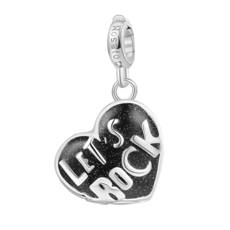 CUORE Rockmantic Cham in argento 925‰, smalto nero glitter, 1 zircone nero e scritta “Let’s rock”. Apertura scrigno Significato: Rock