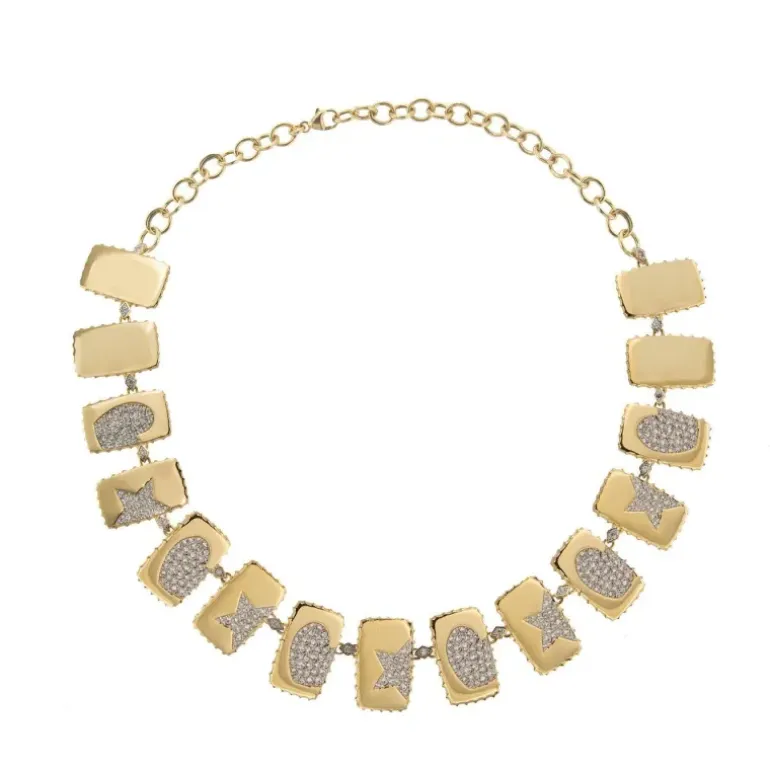 Girocollo Luxury con medaglie cuore e stelle con contorno di mini borchie sui lati. Il girocollo ha 15 medaglie Finitura disponibile: Placcatura oro rosa 18kt o placcatura oro giallo 18kt o placcatura platino. Materiale: Argento 925