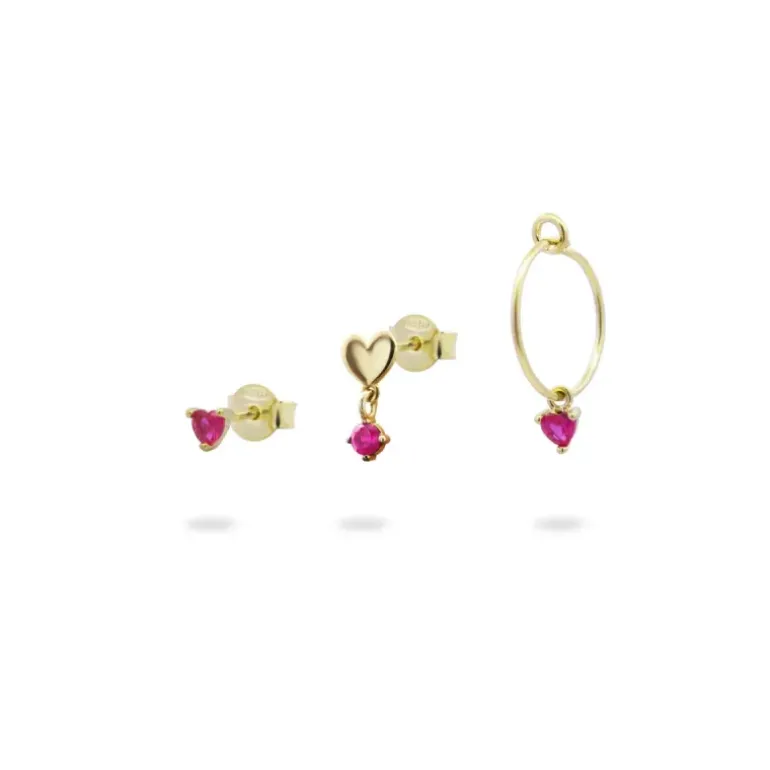Set di orecchini composto da un cerchietto con castone pendente, un orecchino a lobo a forma di cuore e castone pendente in zircone rosso e un orecchino a lobo con cuore tappabuco in zircone rosso La collezione ESSENCE si distingue per la sua delicatezza e l’essenzialità del design. Ogni pezzo è una celebrazione di purezza e semplicità, con linee sottili e forme minimaliste. Gli anelli, bracciali, collane e orecchini sono pensati per essere discreti ma affascinanti e aggiungono un tocco di luce ai simboli iconici Rue des Mille Soggetto: cuore e zircone rosso Materiale: Argento 925 e zircone Finitura disponibile: galvanica oro giallo 18kt e rodio Dimensione sogg: 0,5 cm Diametro bottone: 0,5 cm Diametro cerchietto: 1,2 cm Nichel free Fatto in Italia, con amore