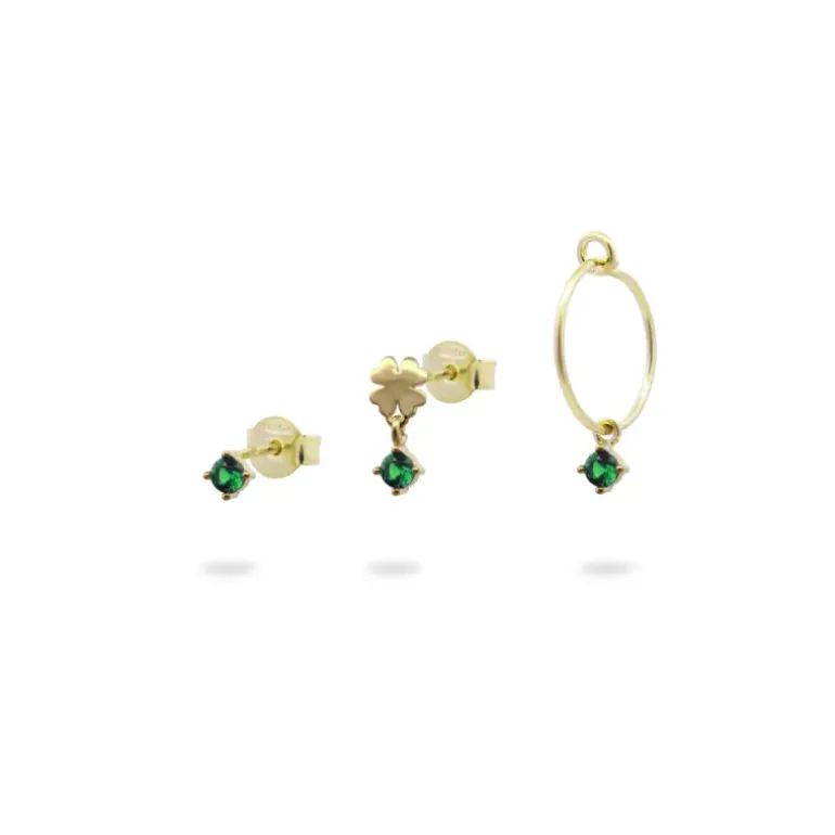 Set di orecchini composto da un cerchietto con castone pendente, un orecchino a lobo a forma di quadrifoglio e castone pendente in zircone verde e un orecchino a lobo con castone tappabuco in zircone verde La collezione ESSENCE si distingue per la sua delicatezza e l’essenzialità del design. Ogni pezzo è una celebrazione di purezza e semplicità, con linee sottili e forme minimaliste. Gli anelli, bracciali, collane e orecchini sono pensati per essere discreti ma affascinanti e aggiungono un tocco di luce ai simboli iconici Rue des Mille Soggetto: quadrifoglio e zircone verde Materiale: Argento 925 e zircone Finitura disponibile: galvanica oro giallo 18kt e rodio Dimensione sogg: 0,5 cm Diametro bottone: 0,5 cm Diametro cerchietto: 1,2 cm Nichel free Fatto in Italia, con amore