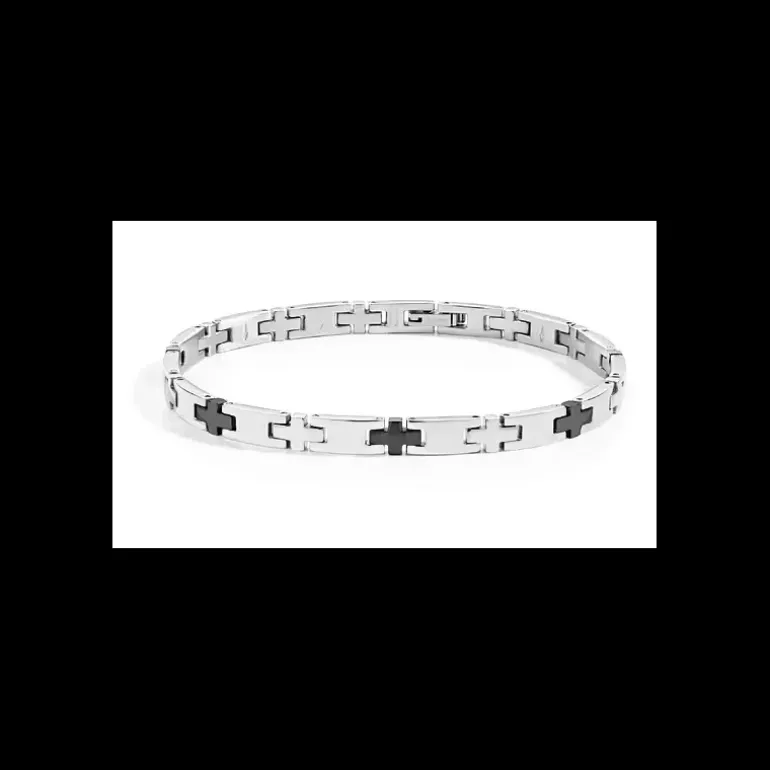 BRACCIALE BASIC IN ACCIAIO CON INSERTI NERI CHE FORMANO DELLE PICCOLE CROCI, RENDENDOLO PECULIARE.