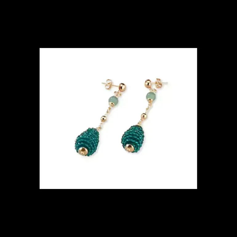 Orecchini da donna di Sovrani della collezione Cristal Magique. Orecchini in ottone con finitura in oro con occhio di gatto verde smeraldo, selenite, avventurina e more verde smeraldo. Lunghezza: cm 5. Chiusura a farfallina. La referenza è: J10119