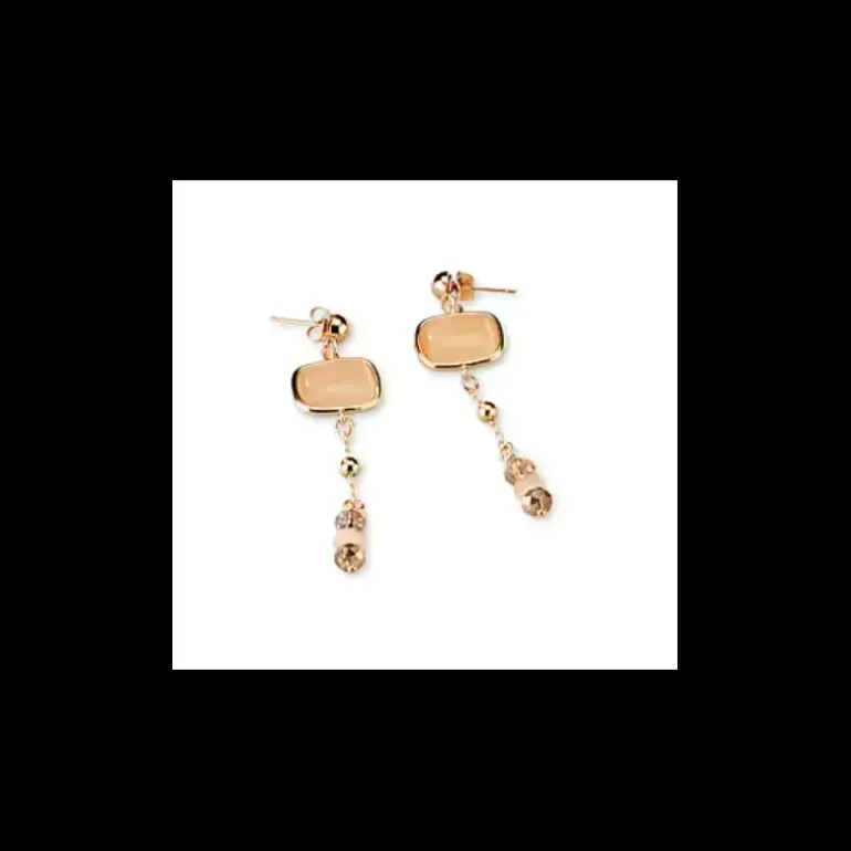 Orecchini da donna di Sovrani della collezione Cristal Magique. Orecchini in ottone con finitura in oro con cristalli occhio di gatto bianco e pesca e rondelline pesca. Lunghezza: cm 7. Chiusura a farfallina. La referenza è: J10093