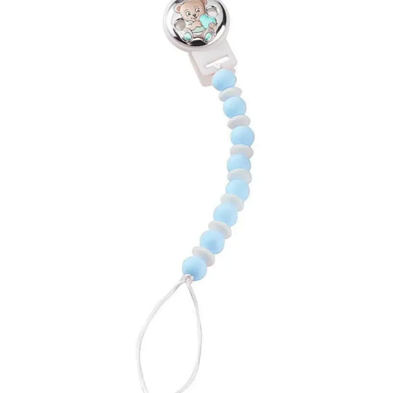 Spilla portaciuccio con simbolo orsetto cuore, silicone e argento laminato di colore celeste.