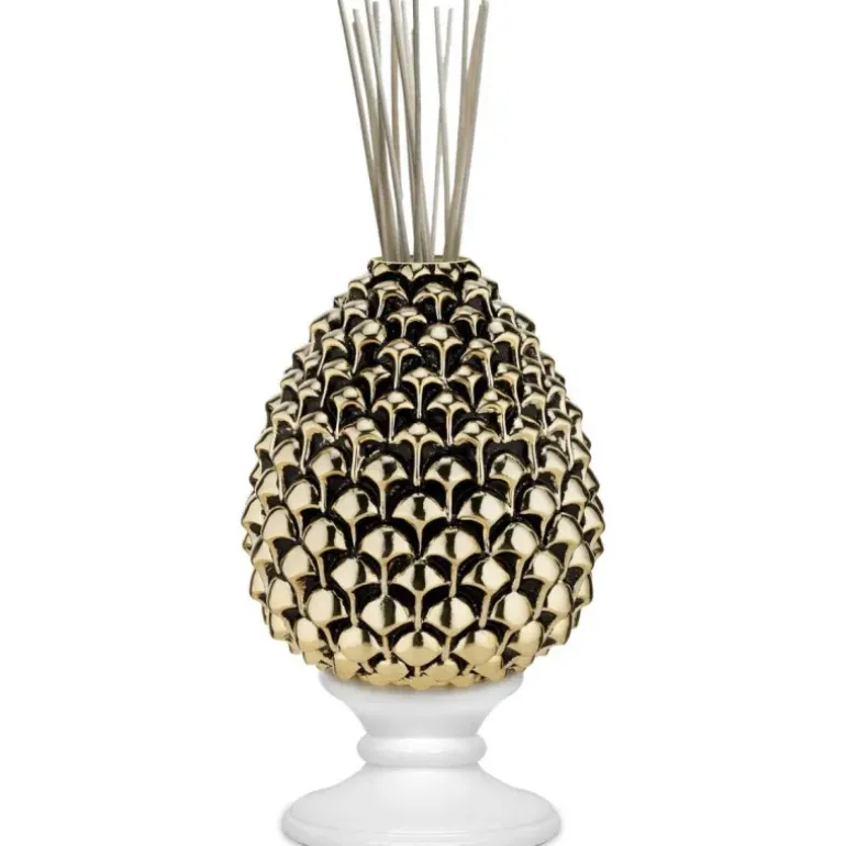 Pigna profumatore realizzata in resina di colore oro con base bianca. La pigna è un elemento dal profondo valore simbolico riconosciuto da diverse culture in tutto il mondo come un simbolo di buon auspicio. In quanto frutto di un albero sempreverde, che resiste alle situazioni climatiche più ostili, la pigna è infatti riconosciuta come simbolo di vita e di forza che supera anche le più terribili avversità. La sua forma e la presenza di numerosi semi, i pinoli, oltretutto, ha fatto sì che questo frutto venisse immediatamente scelto anche come simbolo della fertilità. La pigna, quindi, racchiude in sé alcuni dei significati.Dimensioni: h 15,5.