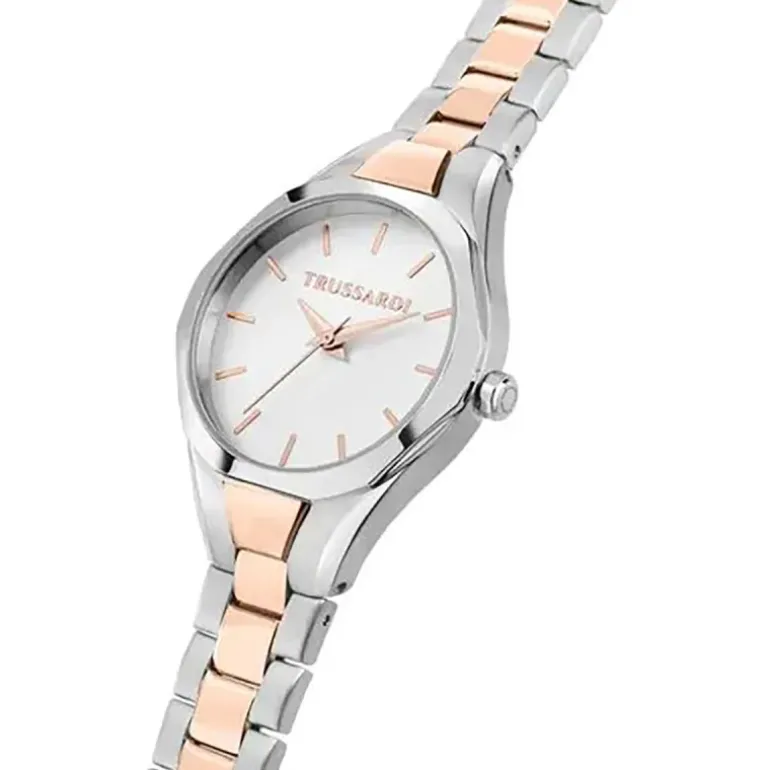 Orologio solo tempo da donna della collezione trussardi metropolitan. l’orologio ha una cassa in acciaio di colore argento di 30mm e cinturino oyster in metallo bicolor silveroro rosa con chiusura deployante a doppio pulsante. Questo solo tempo ha il quadrante di colore bianco con indici a bastoni in rose gold, vetro minerale, movimento al quarzo e resistenza all’acqua di 5atm. Accessorio ideale da indossare tutti i giorni.